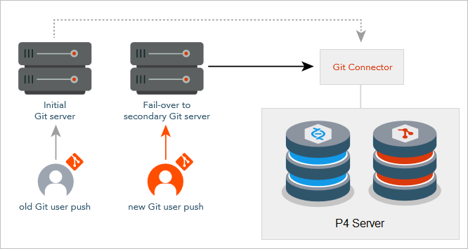 Git Connector can mirror from a Git server, such as GitLab, GitHub, Gerrit, or Perforce TeamHub. If that Git server becomes unavailable, the Git Connector supports the manual configuration of mirroring from the failover server.