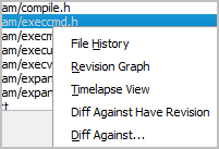 For example, if you want to submit a changelist, when the list of files is filtered to show only the files that you want to submit, click Submit. This area displays the number of files in the changelist and reflects how many files you removed from the changelist. In the dialogs that display files in a plain-text list, the action, such as submit or resolve, applies to all the files that have not been filtered out of the list. To see file history, right-click any file in the list: