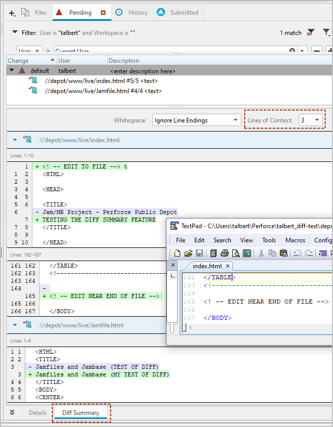 This screenshow shows the Diff Summary tab on the Pending tab. When you make changes to a file on the Pending tab in your editor, the Diff Summary shows the change as well. The Diff Summary will show the differences in the items currently selected. This includes any shelved files you select. In addition to the Pending tab, the Diff Summary appears on the Submitted tab. |
