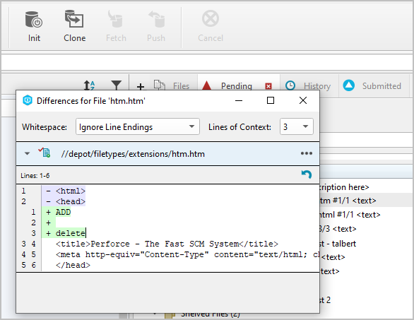 By default, each file segment has three Lines of Context before and after each edit in each file. You can change the number of context lines. For Whitespace, the default is If you want to work with the Diff Summary outside of the P4V window, use the |