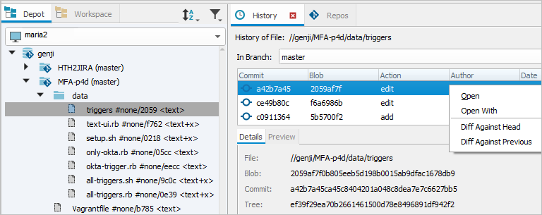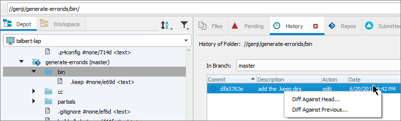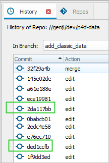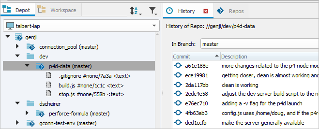 The History tab displays the current branch displays by default, but you can select a different branch.