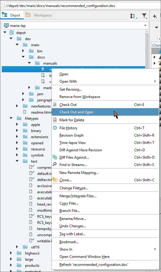 From the Depot tab or the Workspace tab, navigate to a file and right-click. From the context-menu, you might Check Out or Check Out and Open a file so you can edit it.