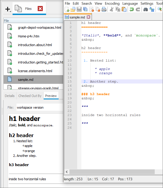 On the Files tab, the Preview pane renders the markdown of a file with markdown tags.