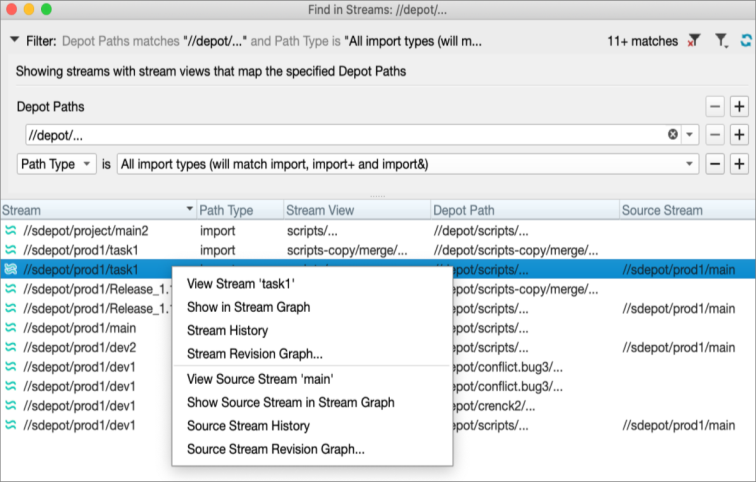 The Find in Streams feature lets you search across streams to find the streams that map the path that you specify.