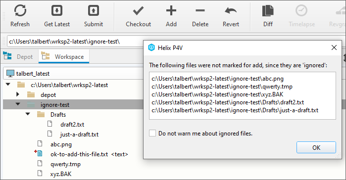 4. On the Workspace tab, verify that + appears for the files you want to add to the depot, and that + does not appear for the files you want the depot to ignore.