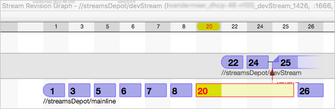 - A dotted red line depicts the implicit inheritance from the latest in the parent stream to the latest in the child stream. In this case, changlist 25 in devStream inherits from changelist 26 in the mainline stream.