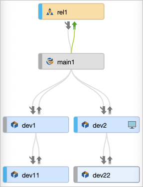 The mainline stream is the parent of rel1, dev1, and dev2.