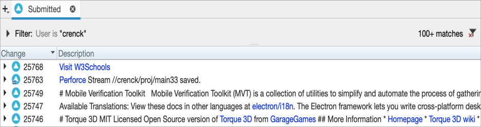 In edit mode, P4V supports internal and external drag-and-drop, cut and paste, and undo/redo operations in the Description fields of changelists of the Submitted tab, as well for specifications, such as job specs, workspace specs, stream specs, and branch specs.