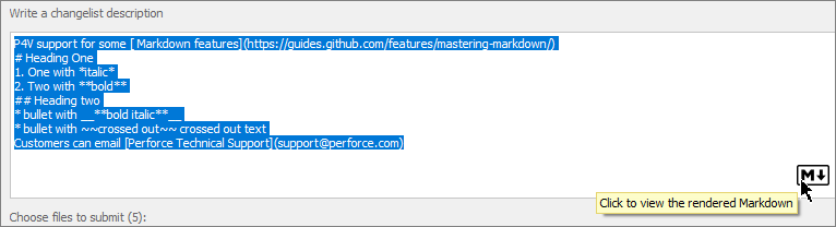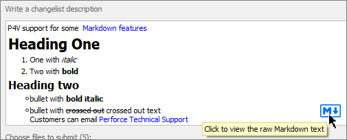 We recommend using Markdown syntax because HTML syntax and Markdown syntax should not be mixed. If you want to use HTML tags, Configure P4V preferences for Features allows you to disable Markdown.