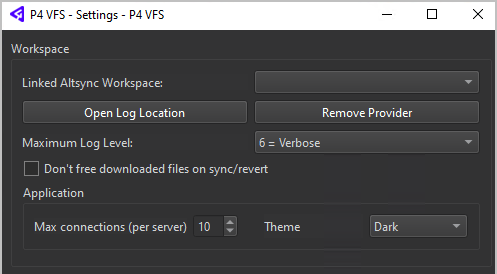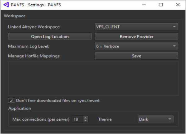 The Manage Hotfile Mappings field is present in the P4 VFS Settings dialog box if your client workspace is enabled with the