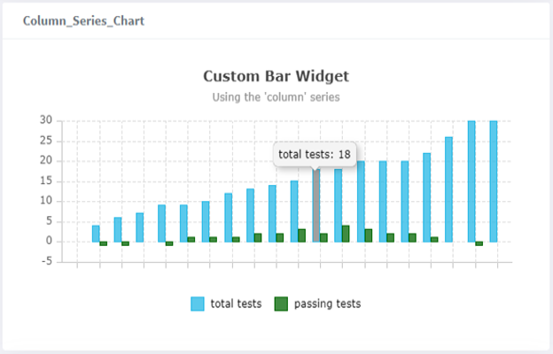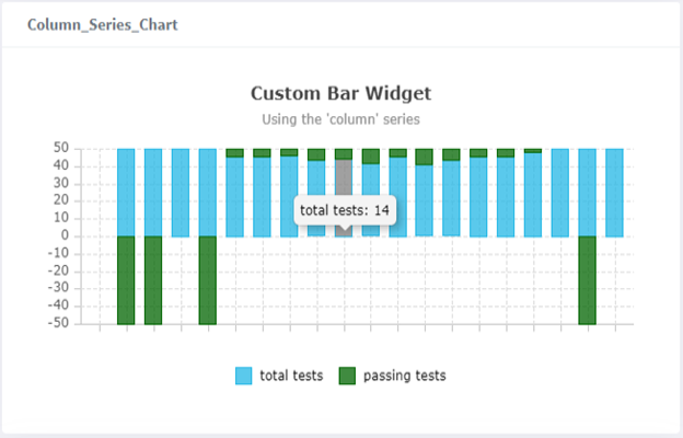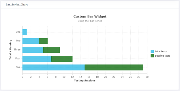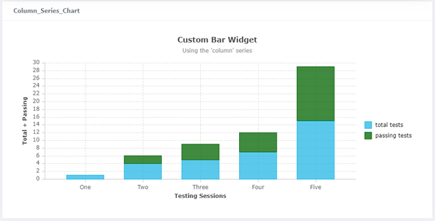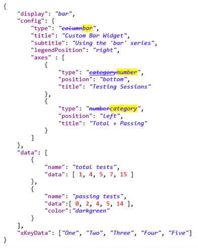 { "display": "bar", "config": { "type": "column", "title": "Custom Bar Widget", "subtitle": "Using the 'column' series", "legendPosition": "right", "axes" : [ { "type": "category", "position": "bottom", "title": "Testing Sessions" }, { "type": "number", "position": "left", "title": "Total + Passing" } ] }, "data": [ { "name": "total tests", "data": [ 1, 4, 5, 7, 15 ] }, { "name": "passing tests", "data":[ 0, 2, 4, 5, 14 ], "color":"darkgreen" } ], "xKeyData": ["One", "Two", "Three", "Four", "Five"] }