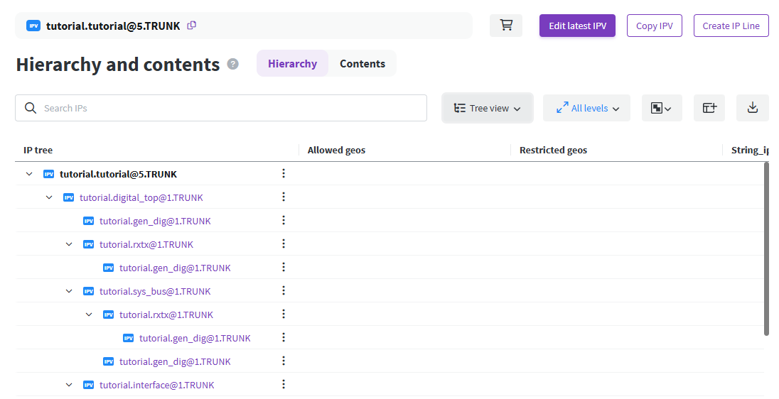 The Perforce IPLM IP Hierarchy is a hierarchical Component and IP BOM (CIPB) that can be used to capture a release of a fixed set of IP data. Each IP in the hierarchy is captured with its required resource dependencies, and can potentially be reused in other contexts with full traceability.