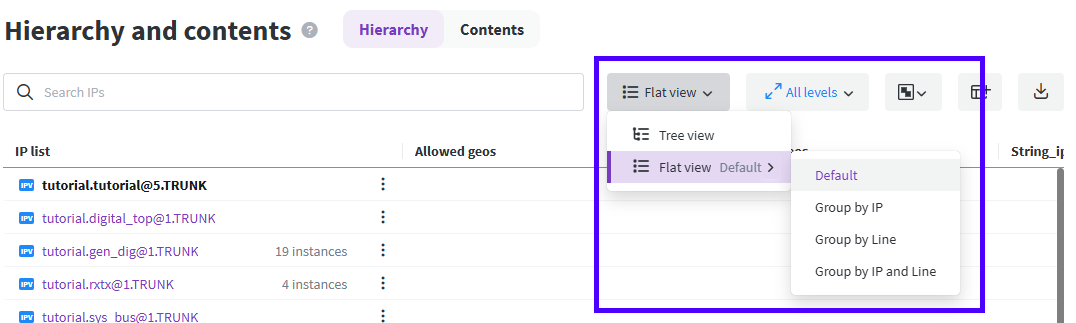 Use the search to find an IP in the Hierarchy. In Tree view the parent IPVs in the hierarchy are shown above matching filtered IPVs. In Flat view, only the actual filtered IPVs will be shown, so it may be easier to parse the results of the search.