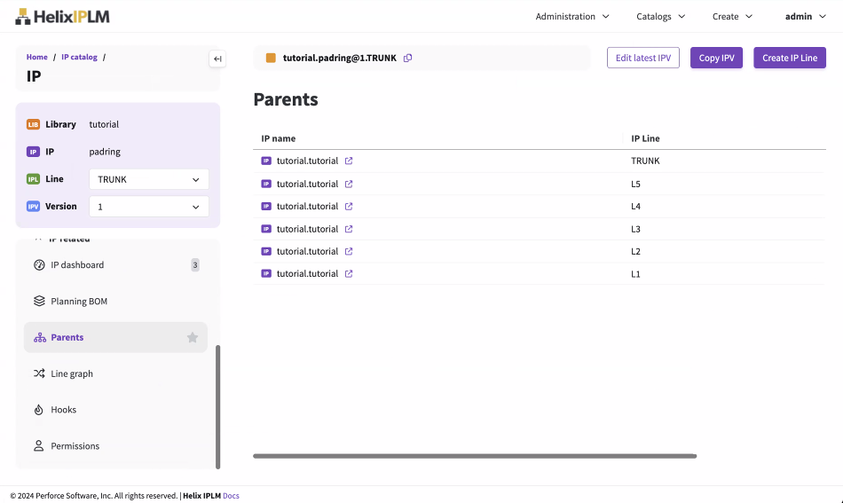 Copying IPs in Perforce IPLM maintains a record of which IPV a new IP or IP Line was copied from, see Copying IPs and IP Lines (Branches) for more information on copying IPs in Perforce IPLM.
