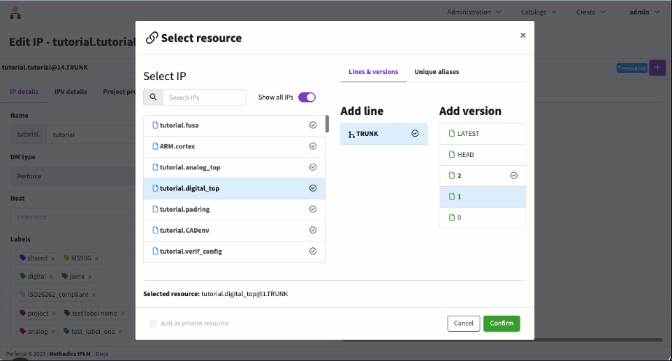 IP Resource management is also available from the Command Line interface (CLI) either via the 'pi ip edit' command (for an existing IP) or the 'pi ip add' command (when creating a new IP). These capabilities mirror the IPLM Web configuration options for resource names, versions, and lines.