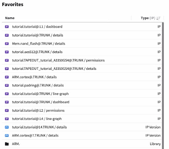To add a page to the Favorites, open the page or tab and click the star icon. On IPV related tabs you can favorite either the currently selected IPV release or the @LATEST release on the line. Favoriting @LATEST will return you to the most recent release available on that IP Line at the time. Clicking the star icon again removes it from your favorites. The number of favorites in the list is unlimited, but if there are too many to show on a single page, a Show more button will be displayed.
