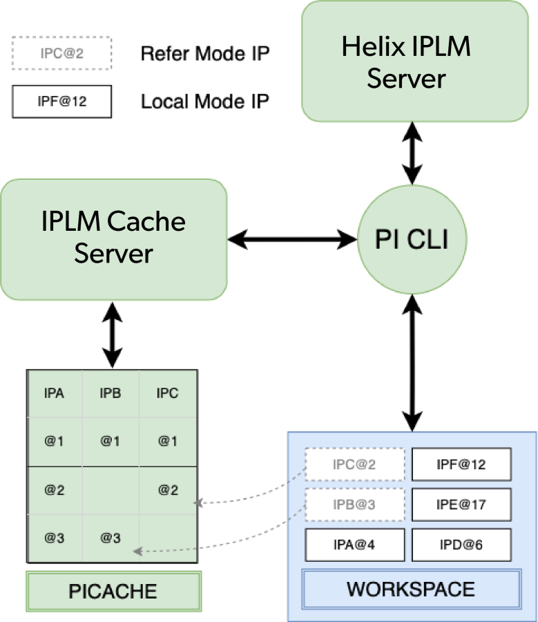 IPVs can be loaded into the cache on demand via workspace load or workspace update, or they can be populated directly with the pi ip publish command. IPVs are switched between local and refer mode with the pi ip local and pi ip refer commands respectively. If an IPV has not yet been populated into IPLM Cache.