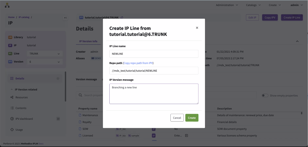 Select Create line on the IPV page. The Create line window opens. Enter the new Line name, the Repo Path, and the Version Message.