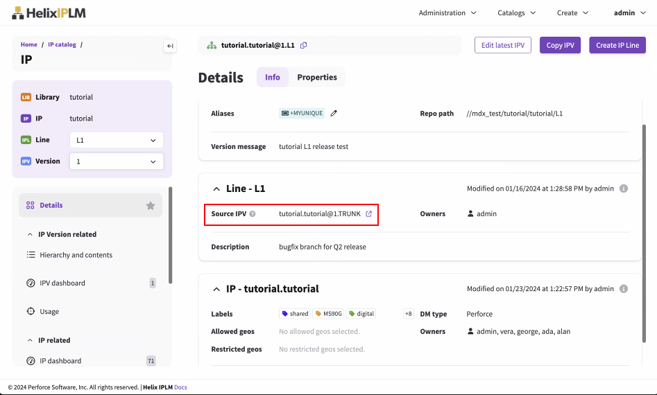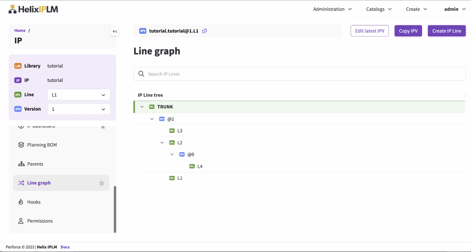 Perforce IPLM can track multiple lines of development for each IP. Each IP Line has a series of independent, sequential releases. The relationship between IP Lines is tracked when a new line is created with IP copy. This page describes how to create and manage IP Lines. IP Lines are used to track IP variants, and to track new drops of external IPs. When IPVs are copied to new lines or entirely new IPs the IPV source of the copy is retained in the newly copied object. This provides traceability of the copy history of any series of IPs.