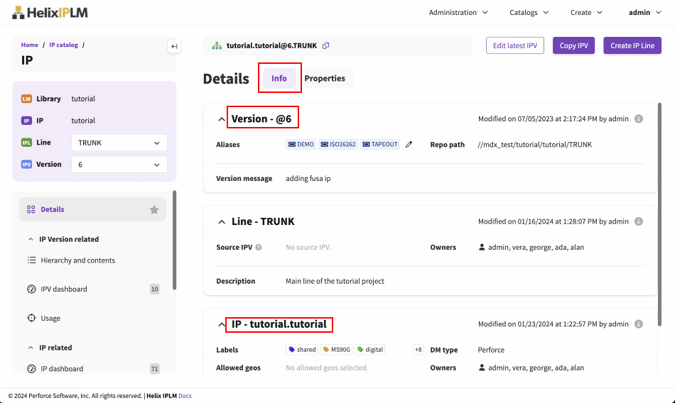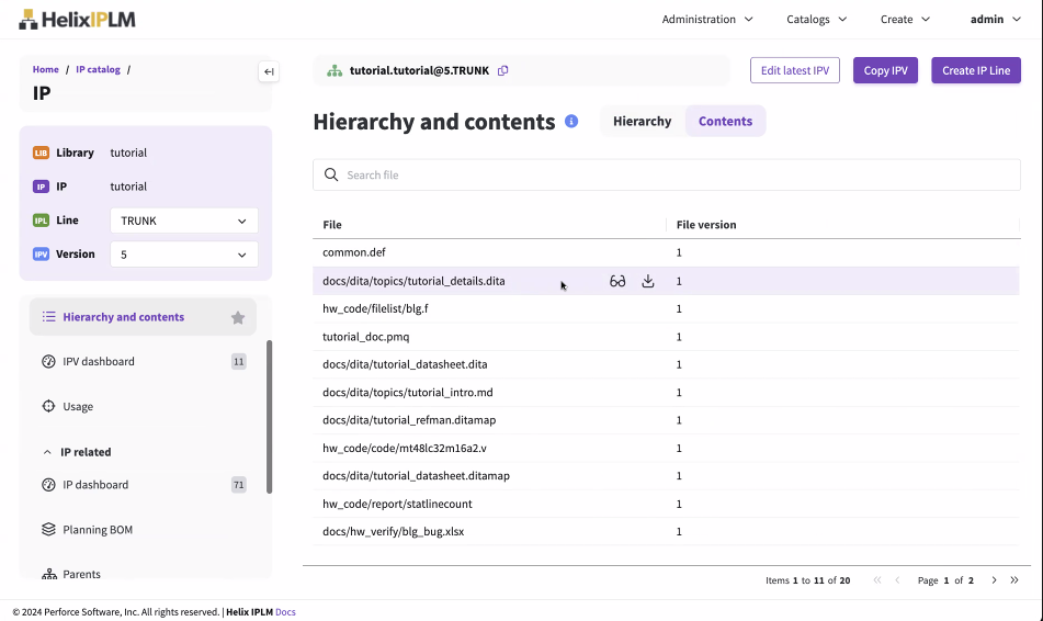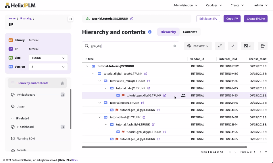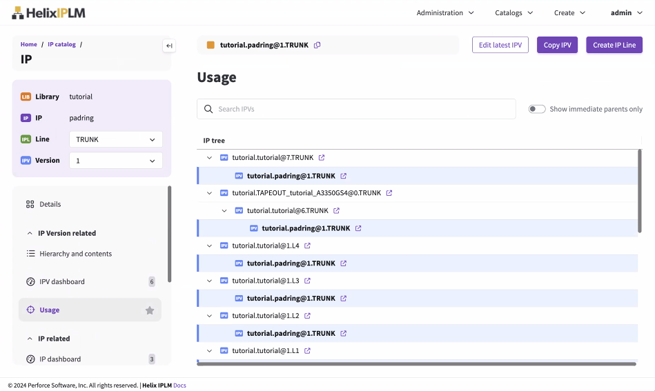 The Usage tab  shows where the IPV is used across the Perforce IPLM platform. It starts from the bottom of the IP Hierarchy and looks up to the top level IPVs in the trees that use the IPV. Tracking IP usage is a key traceability function, enabling issue tracking, license auditing, and similar functions. See Tracing IP Usage on the Server for more information.