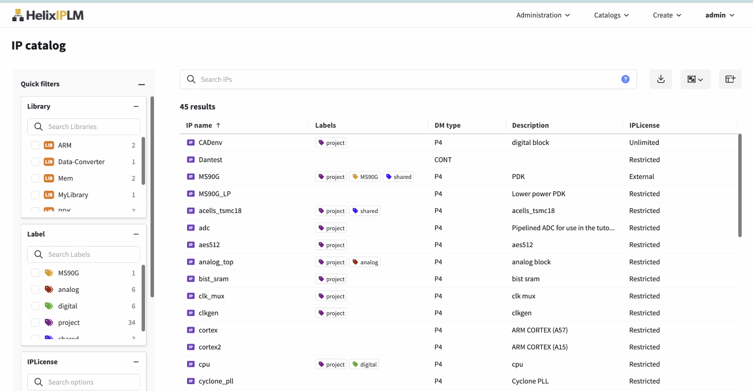 The IP Catalog page displays the IPs available in the Perforce IPLM platform. The Catalog can be filtered by IP Library, Labels, IP data fields, and IP properties. The catalog can be searched by all IP fields from the top search box. For more information, see IP catalog.