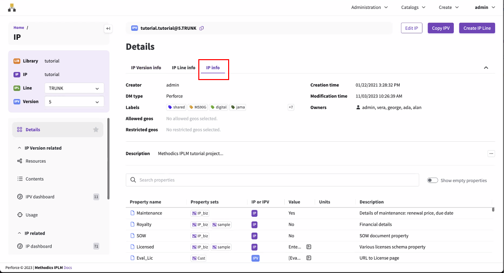 Open an IP in the IP Catalog, and select the Details tab. Information on IP Releases, Lines, Properties, Usage, Permissions, and other information about the IP and its releases are available.