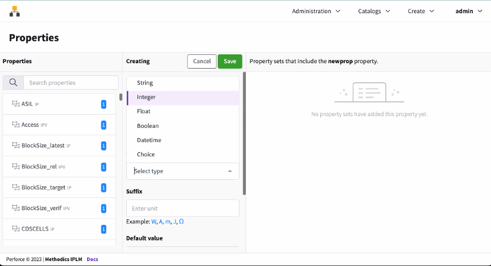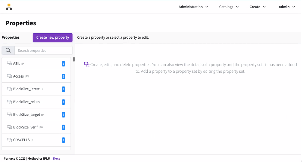 Properties and Property sets are used to extend the built in Perforce IPLM data model to include customer specific fields. Licensing, process info, lifecycle status, functional safety compliance, and workflow values are some examples of quantities often tracked as properties. This section describes the configuration options available for Perforce IPLM properties and property sets in both IPLM and PiCLI.Property and Property Set overview
