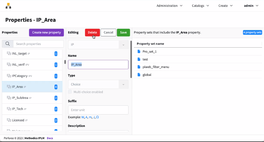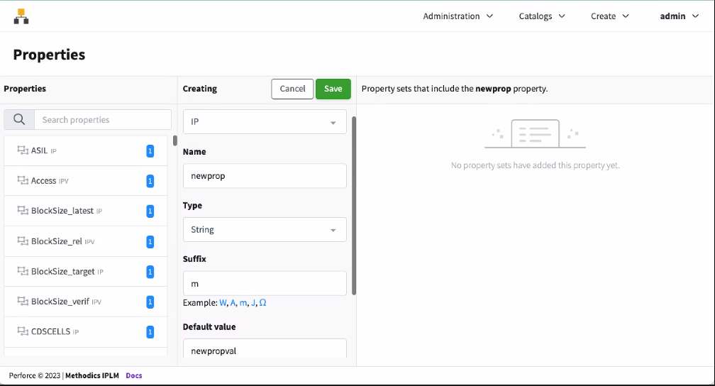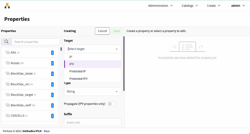 When a property is created in Perforce IPLM it is invisibly attached to all IPs or IPVs in the system in the Perforce IPLM data model. Adding the property to a property set and attaching the property set to an IP makes the property visible on the IP or IPV. If a value is set on a property while it is revealed by a Property Set and then all Property Sets that include that property are removed from the IP, the property and its value become hidden. They are not accessible from any Perforce IPLM client while hidden, but if a Property set including that property is again attached to the IP, the property and its value will be made visible again. Deleting a property will remove it and any values that have been set from all objects in the platform.