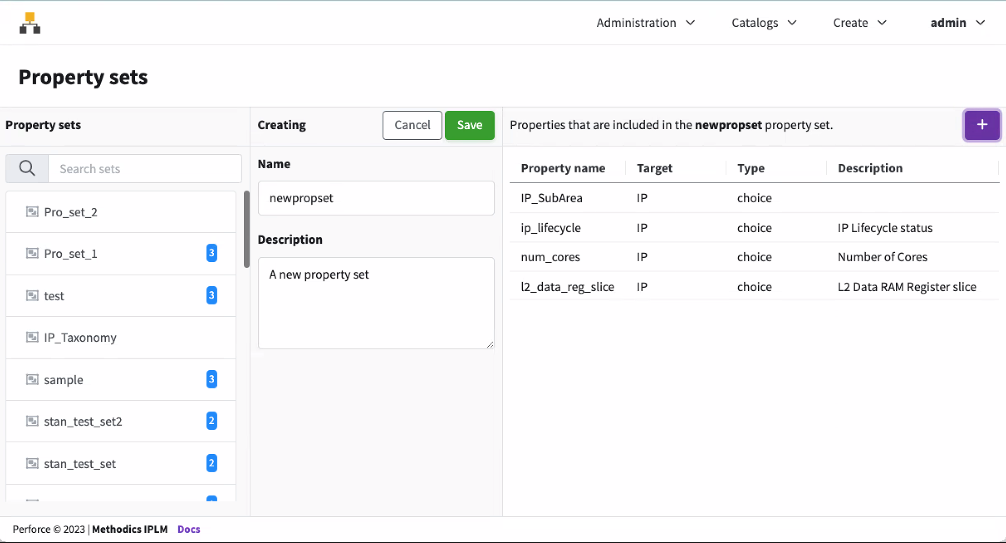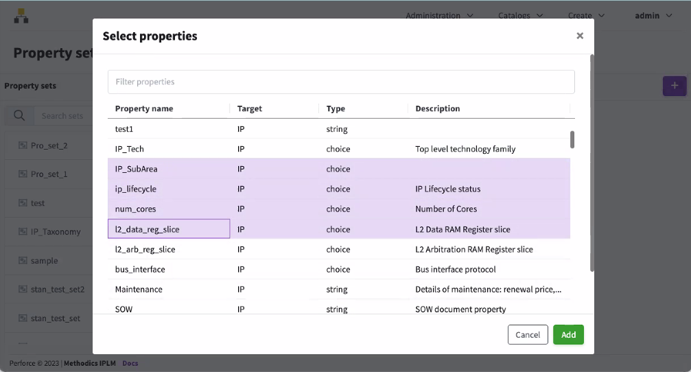 Properties in Perforce IPLM are first defined individually. Once defined multiple properties are gathered into Property Sets. These property sets are then applied to IPs or IPVs.