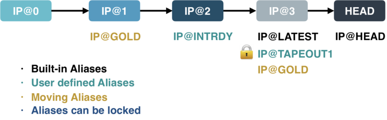 Instead of referring to an IPV by its numerical release, meaningful names can be applied to each release or to multiple releases if desired. These Alias names can be defined as needed for a given flow. Aliases are normally used when specifying quality level, or indicating which releases have special importance, e.g. which was the tapeout version, etc.