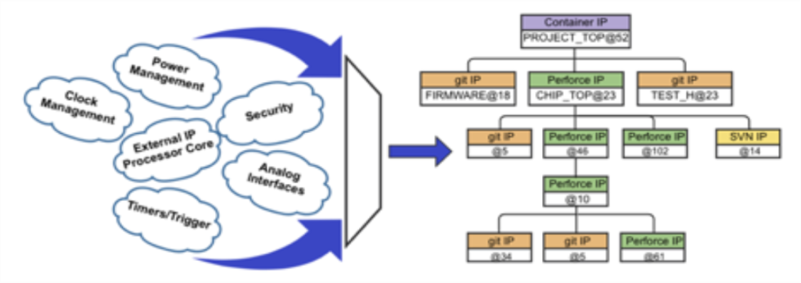 By abstracting each component as an IP in Perforce IPLM, multiple disparate, siloed, systems can be unified into the common Perforce IPLM platform. A CIPB consisting of IPs that manage data in entirely different DM systems becomes trivial in Perforce IPLM. The correct release of a git based IP can be tracked along with its dependency on a particular release of a Perforce based IP, and the Perforce IP's dependency on several other IPs of whatever DM type can be tracked just as easily. Each is represented as an IP in Perforce IPLM, each has the same capabilities in the Perforce IPLM platform, they only differ in how their design files are managed.