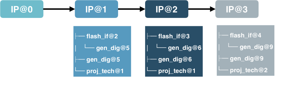 In addition to capturing the contents of an IP component in a release, the IPV also captures dependencies on other IP components at specific versions. In capturing dependencies on other IPVs, Perforce IPLM builds up a Component and IP BOM (CIPB), or IP Hierarchy. This hierarchy can be any number of levels deep. Each IPV in the IP Hierarchy is the same type of IP object as any other, so different levels of hierarchy can be used in their own context. A subsystem can be loaded into a workspace and developed, simulated and released. This same subsystem can be loaded in another workspace as a resource of a larger project or SOC where the subsystem becomes just one subset of the higher level IP Hierarchy.