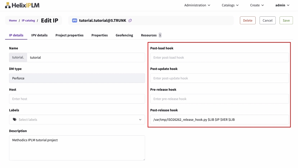 Client side hooks are defined via fields on the IP object or on the Library object. Each hook event is a separate field in the IP or Library template. If the field is defined on the Library the defined hook script will be run on every IP in that Library when the specified event occurs. If it is defined on the IP the hook will be run for events that occur on that IP only. Fields set on an IP override the corresponding setting of a field on the Library. It requires IP or Library write permission to set hook scripts on an IP or Library respectively.