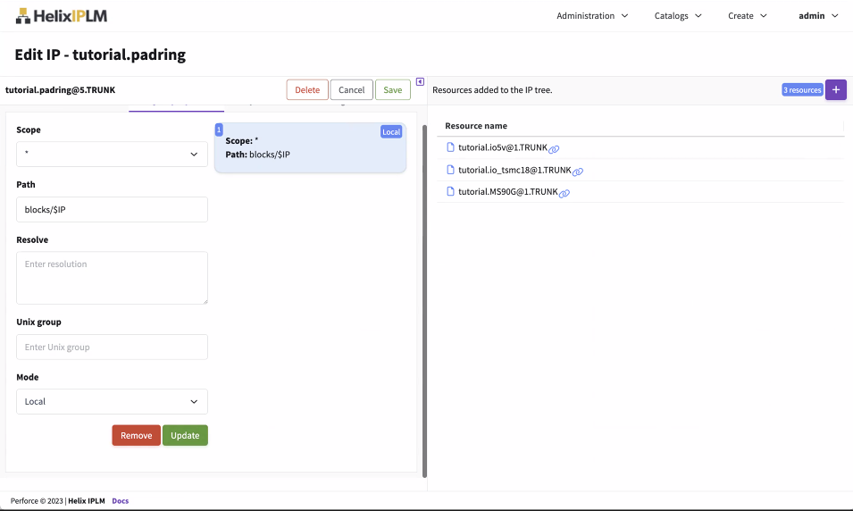 The path definition can include the variables $LIB and $IP which will be resolved to the IP and Library names of the IP. Note that it is in most cases necessary to use the $IP variable when using <ip ident> specifications that can match multiple IPs, so that the IPs are placed in separate directories in the workspace. Perforce IPLM won’t place a new IP into an already existing IP directory.