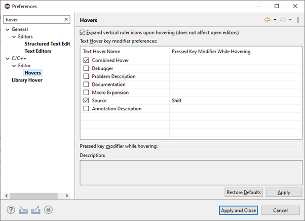 In the search field at the top left of the Preferences dialog, type hover and select Hovers under C/C++ tree.
