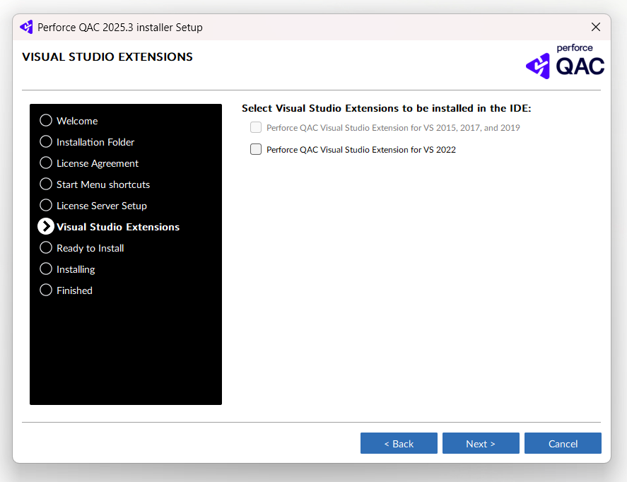 The Perforce QAC Visual Studio extension can be installed as part of the Perforce QAC installation, by selecting the “Perforce QAC Visual Studio Extension [2015, 2017 and 2019]” or “Perforce QAC Visual Studio Extension [2022 and above]” checkbox in the dialog.