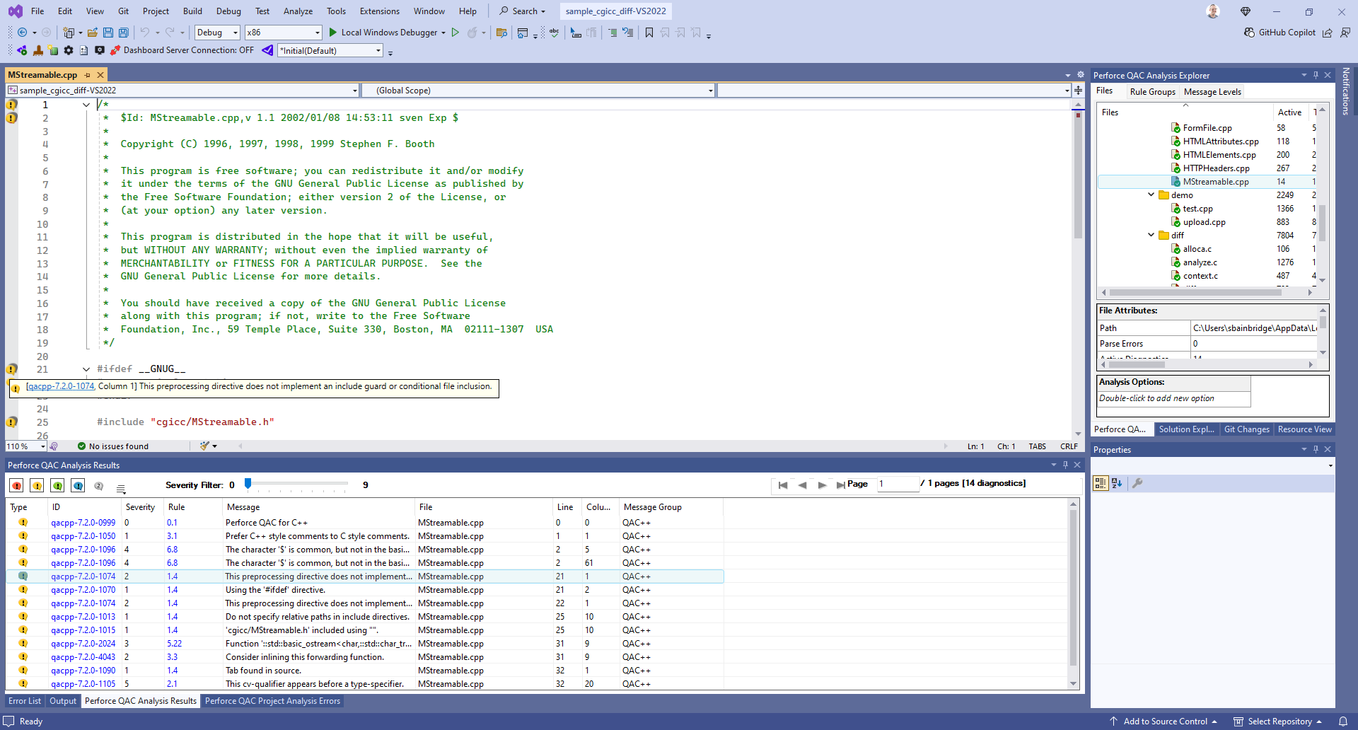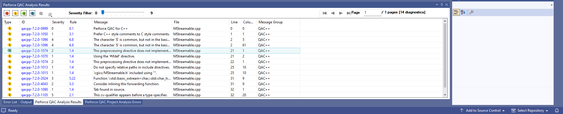 Selecting View > Perforce QAC Analysis Results Window displays the panel shown in the example below. It is populated with diagnostic results when analyzed files are selected in the Files panel of the Perforce QAC Analysis Explorer: Files Panel.