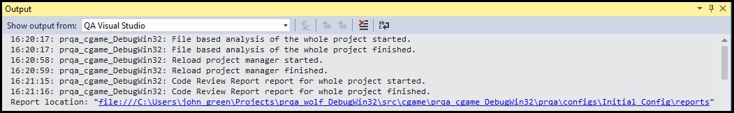 The actions performed by Perforce QAC Visual Studio during the current session are written to the Output panel.
