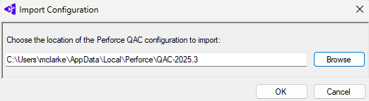 このオプションを使用すると、下に示すように、別のバージョンのPerforce QACから設定をインポートできます。これにはユーザ設定やライセンス設定が含まれます。