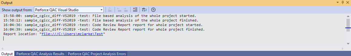 また、レポートの出力先のリンクがVisual Studioの[出力]パネルに表示されます。 例: