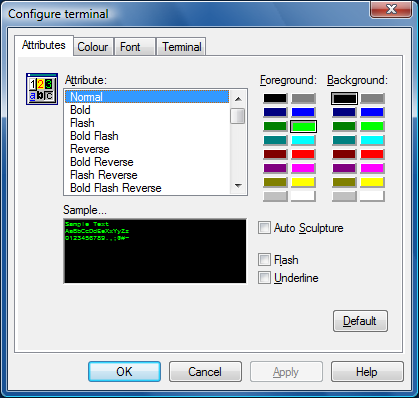 The Attributes option from the Configure menu allows you to change the colour of your terminal display’s attributes, that is, the normal setting, the bold setting and so on. You can also set the Auto Sculpture option where it is relevant.