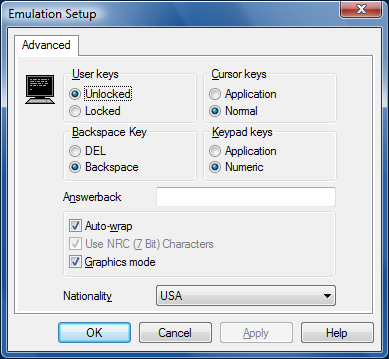 Use Answerback to specify a message to be returned to the host from HostAccess when the host requests an answerback message. |