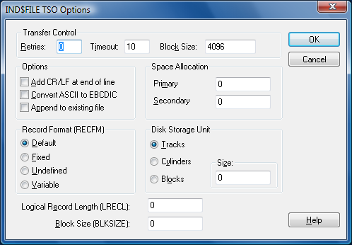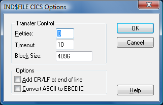 When sending a file to the mainframe, the options vary according to the host system. To a CICS system, the options above all apply (although CR/LF pairs are removed instead of added, and ASCII characters will be converted to EBCDIC instead of the other way around). In addition, the user can specify the block size to be used for the transfer. This only applies if the host agrees to use IBM’s Block Mode of transfer.