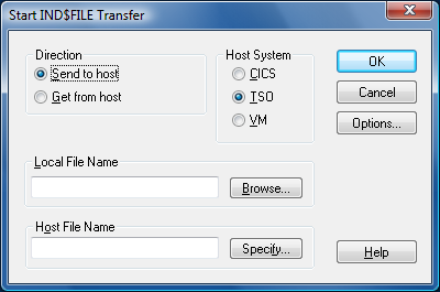 While running a 3270 emulation, the System|Start file transfer… menu option will initiate an IND$FILE transfer. This must be done while the cursor is at a command line. The user is prompted to identify the direction of transfer, the host system to which you are connected as well as the file name on the PC and the file name or dataset name on the host.