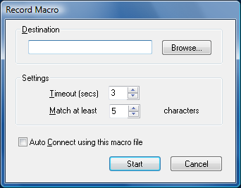 The pause option allows you to stop recording a macro temporarily and then restart it. This is useful in a situation where, for example, you are recording an auto connect macro. You want to record the password in the macro, but you can’t remember it. Clicking the Pause button or selecting Macro, Pause recording from the System menu at the password prompt will stop the macro from recording any time outs that may occur while you are finding out the password. Clicking or selecting Pause again will restart the macro.