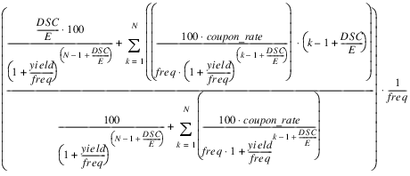 In the equation above, DSC represents the number of days starting with the settlement date and ending with the next coupon date. E represents the number of days within the coupon period. N represents the number of coupons payable from the settlement date to the maturity date. freq represents the frequency of the coupon payments annually.