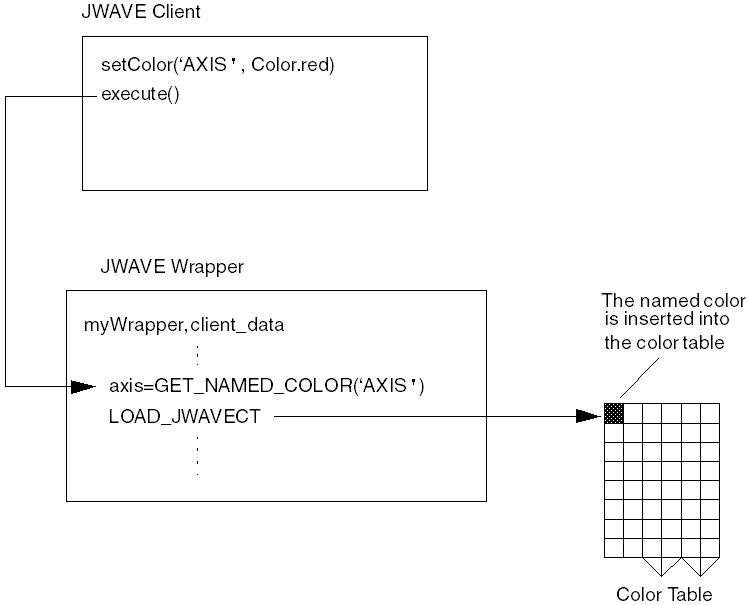 Figure A-1: Retreiving a Color on page 188 illustrates how a color table is created in a JWAVE wrapper. When LOAD_JWAVECT is called, a color table is created with the named colors loaded into a subset of the color table.