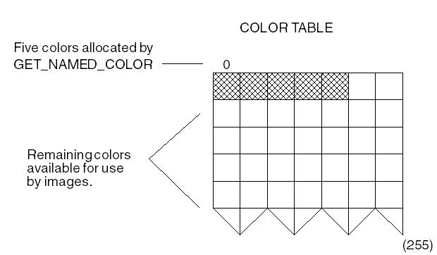 Figure A-2: Named Colors in a Color Table on page 189, the first five colors are allocated to the named colors. The remaining colors fall in the range {5..255}. These are the colors that are available for use by images, and {5..255} is the range that is returned by the