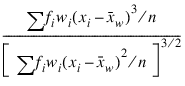 Frequencies, fi’s, are interpreted as multiple occurrences of the other values in the observations. In other words, a row of x with a frequency variable having a value of 2 has the same effect as two rows with frequencies of 1. The total of the frequencies is used in computing all the statistics based on moments (mean, variance, skewness, and kurtosis). Weights, wi’s, are not viewed as replication factors. The sum of the weights is used only in computing the mean (the weighted mean is used in computing the central moments). Both weights and frequencies can be zero, but neither can be negative. In general, a zero frequency means that the row is to be eliminated from the analysis; no further processing or error checking is done on the row. A weight of zero results in the row being counted, and updates are made of the statistics.