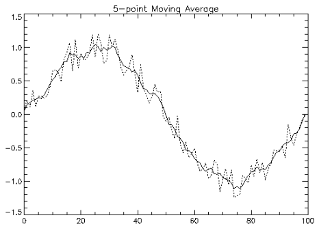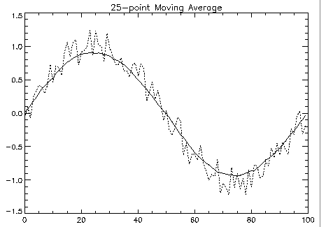 In this example, CONVOL1D is used to compute simple moving-average digital filter plots of 5-point and 25-point moving average filters of noisy data are produced. Results are shown in figures